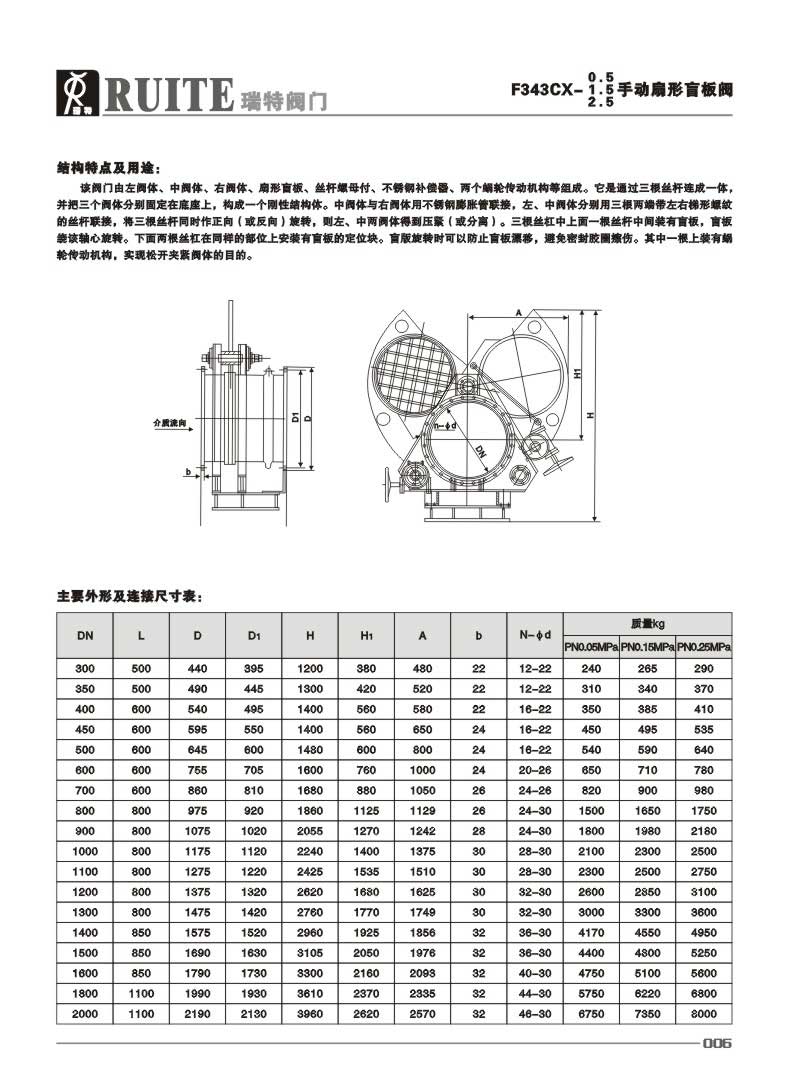 F43X型手動扇形盲板閥由左閥體、右閥體、中閥體、連接螺桿(三根)組成。用板手旋轉連接螺桿,使左右閥體完成夾緊和松開動作,利用閥板上盲板和通孔板的位置變換達到啟閉目的。具有結構簡單,重量輕,性能可靠,操作方便等特點。